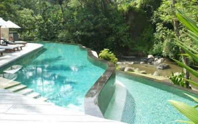 3/ Elle semble perdue en plein coeur d’une forêt vierge. Avec son eau turquoise, cette belle piscine à débordements sur 2 niveaux, tranche avec les eaux tumultueuses de la rivière toute proche.