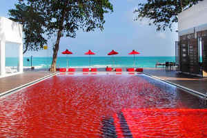 Au Library Hôtel à Koh Samui en Thaïlande vous pourrez également vous baigner dans sa piscine rouge, avec en prime, vue sur la mer.
