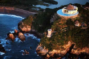 Pour être top, elle serait à débordement, en haut d’une falaise sur laquelle viennent s’écraser les vagues. Une situation époustouflante pour un hôtel qui semble flotter au milieu de l’eau.